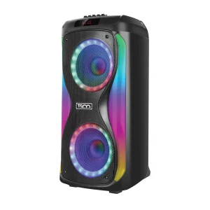در نگاه اول، TS 1917 با طراحی مدرن و ظاهر اسپرت خود جلب توجه میکند. بدنه اسپیکر از پلاستیک فشرده مقاوم ساخته شده که در برابر ضربههای معمولی و حملونقل روزانه عملکرد خوبی دارد. دستگیره مقاوم تعبیه شده در بخش بالایی اسپیکر، حمل آن را بسیار آسان کرده و باعث میشود TS 1917 گزینهای مناسب برای جابهجایی و استفاده در فضای باز باشد. نورپردازی RGB روی بدنه اسپیکر نیز جلوهای زنده و هیجانانگیز ایجاد کرده و به خصوص در محیط تاریک، زیبایی اسپیکر را چند برابر میکند.